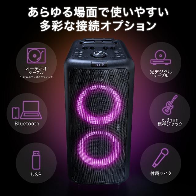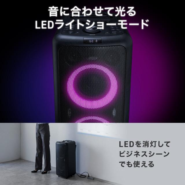 ●再生音楽に合わせてLEDライトが変化するライトショーモードを搭載しています。パーティーなどを盛り上げる演出が可能です。※設定でLED点灯をOFFにもできます。