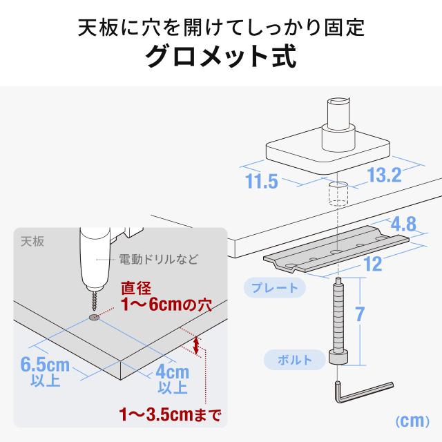 ■取り付け対応デスク:クランプの場合/天板厚み1〜8cmまでのデスク、グロメットの場合/天板厚み1〜3.5cmまでのデスク