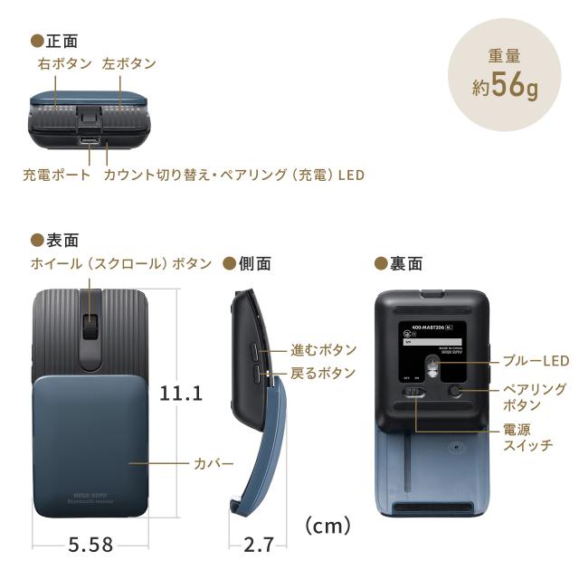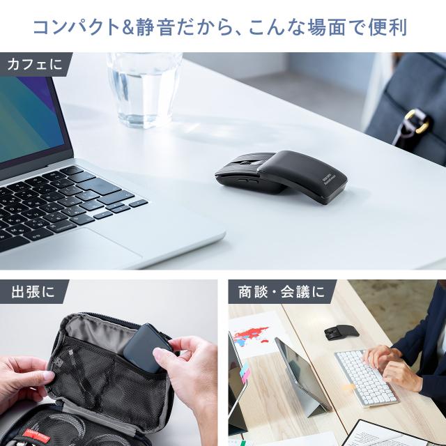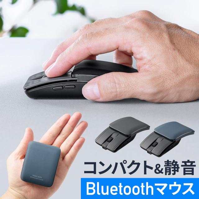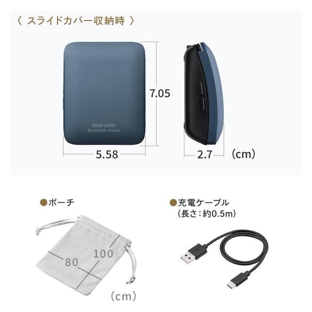 小型マウス Bluetooth 静音 5ボタン 戻る 進むボタン ホイール スライドカバー ポーチ付き 持ち運び コンパクト モバイル 充電式 スリム 軽量 ブラック ブルー[400-MABT206]