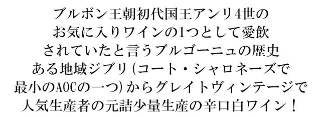 ブルボン王朝初代国王アンリ4世の お気に入りワインの1つとして愛飲 されていたと言うブルゴーニュの歴史 ある地域ジブリ(コート・シャロネーズで 最小のAOCの一つ)からグレイトヴィンテージで 人気生産者の元詰少量生産の辛口白ワイン!