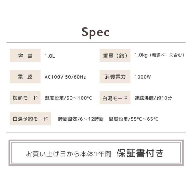 Details 【白湯専科電気ケトル】 まいにち続けたい温活『白湯』が電気ケトルで簡単に作れる!10分の連続沸騰でカルキを飛ばす『白湯モード』や、時間と温度を指定して白湯を作れる『白湯予約モード』を搭載した、忙しい日々にぴったりの『白湯専科』電気ケトル。50度〜100度間の温度調整や保温機能など、通常のケトルとしての機能も充実!不純物を飛ばして温度を調節できるので、美味しいコーヒー、お茶などはもちろん赤ちゃんのミルク作りなどにも便利です。転倒してもお湯がこぼれにくい構造でお子様やペットがいるご家庭でも安心。ナチュラル・シンプルなデザインはプレゼントにもぴったりです。 ブランド名 DOSHISHA / ドウシシャ 品番 EKZ-102M サイズ 本体:約W22.5×D19.0×H21.5cm(電源ベース含む) 電源コード:約70cm 容量 約1.0L 重量 約1.0kg(電源ベース含む) 仕様 電源:AC100V 50/60Hz 定格消費電力:1000W 運転モード [加熱モード]温度設定:50〜100℃ [白湯モード]連続沸騰:約10分 [白湯予約モード]時間設定:6〜12時間、温度設定:55〜65℃ 付属品 ・本体 ・電源ベース(コード70cm) ・取扱説明書(1年保証付き) 生産国 中国 ご注意 ※表記サイズより、多少の誤差があることがございます。 ※商品の画像はできる限り実物に近づけるよう配慮しておりますが、お使いのモニターやご覧になる環境によりましてはカラーの見え方に差が出る場合がございます。ご了承くださいませ。 関連キーワード 白湯専科電気ケトル 白湯専科 電気ケトル 温度調節付き 白湯 さゆ さ湯 ミルク カルキ抜き 保温 機能付き 温活 グッズ おしゃれ かわいい 1L ドウシシャ ON℃ZONE オンドゾーン EKZ-102M 温度設定 予約 電気ポット 湯沸かし器 湯冷し コーヒー ドリップ 紅茶 お茶 美味しい 赤ちゃん 粉ミルク 転倒防止 安全 洗える 1.0L 1000ml 魔法瓶 オフィス ダイエット 健康 朝活 引っ越し 結婚 新居 お祝い 引っ越し祝い 一人暮らし 新生活 オフィス 誕生日 プレゼント ギフト シンプル 北欧 グレー アイボリー ピンクベージュ 白 ホワイト 20代 30代 40代 50代 60代 70代 80代 大学生 学生 息子 娘 孫 女性 女子 レディース 男性 男子 ボーイズ 父 母 おかあさん おとうさん パパ ママ シニア おじいちゃん おばあちゃん お爺ちゃん お婆ちゃん 祖父 祖母 じいじ ばあば バースデー お祝い 粗品 景品 送別会 イベント 母の日 父の日 敬老の日 クリスマス クリスマスプレゼント バレンタイン チョコ以外 ホワイトデー オシャレ お洒落 可愛い カワイイ シンプル かっこいい カッコいい カッコイイ | |||||||||||||||||