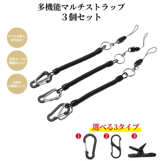多機能 マルチストラップ 伸びる ストラップ カールコードストラップ コイルストラップ バンジーストラップ スマホ キー ストラップ コードストラップ コイルチェーン 紛失 落下防止 太め カラビナ付き 3個セット