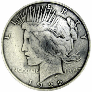 1922年のワンダラー、コインコンチョのレプリカでモルガンダラーの後に発行された羽をたたんで休息している鷹は平和を表しておりピースダラーと呼ばれる。