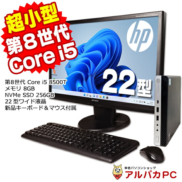 デスクトップパソコン 中古 Windows11 超小型 軽量 HP EliteDesk 400 G4 DM 22型ワイド液晶セット 第8世代 Core i5 8500T メモリ8GB NVMe SSD256GB Windows11 Pro デスクトップパソコン Office付き