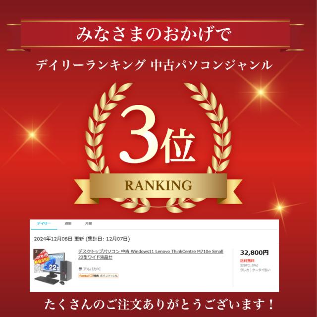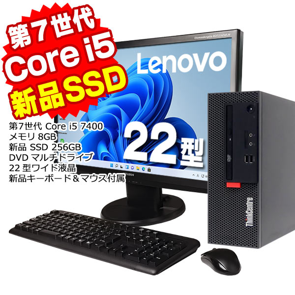 デスクトップパソコン 中古 Windows11 Lenovo ThinkCentre M710e Small 22型ワイド液晶セット 第7世代 Core i5 7400 メモリ8GB 新品SSD256GB DVDマルチ Windows11 Pro デスクトップパソコン Office付き
