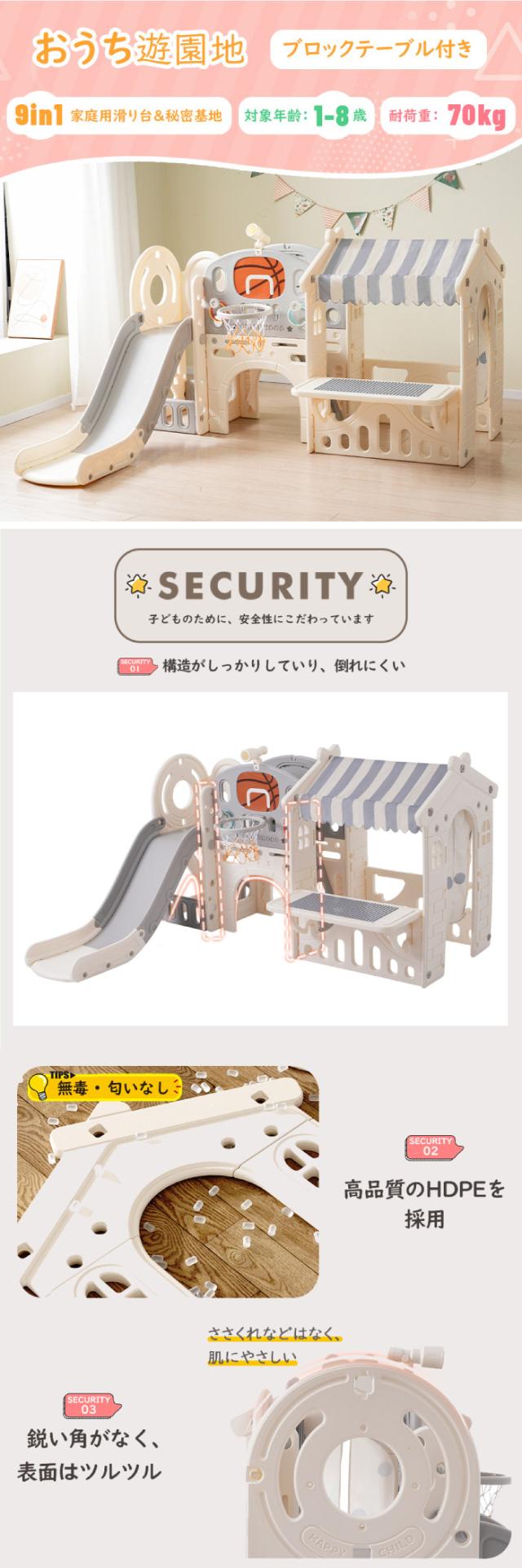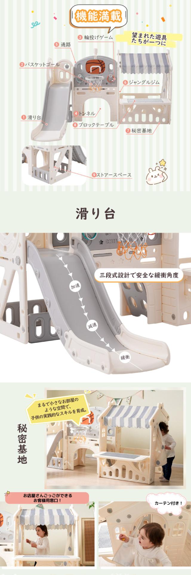 お子様の想像力と運動能力を刺激する、多機能室内遊具です。緩やかなスロープの滑り台は三段式設計で安全に配慮され、バスケットゴールと輪投げゲームが運動神経を鍛えます。通路とトンネルは子供たちの探検心をくすぐり、ジャングルジムはバランス感覚と協調能力を育てます。さらに秘密基地ではお店屋さんごっこが楽しめ、ブロックテーブルで創造力も発揮できます。トンネル内には収納スペースも備え、整理整頓の習慣も身につきます。HDPE素材で安全性も確保し、EN71安全性テストもクリアしているため、親御さんも安心。遊び心満載で、子供部屋にもリビングにもぴったりなデザインです。