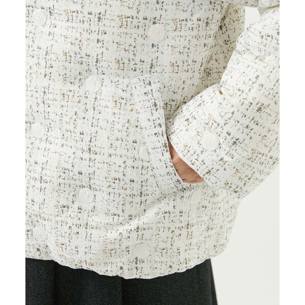 ナイロン生地にややエレガントな光沢のあるプリントをしています。中にはリサイクルダウンを使用し、しっかりと防寒できるあったかダウンコートです。