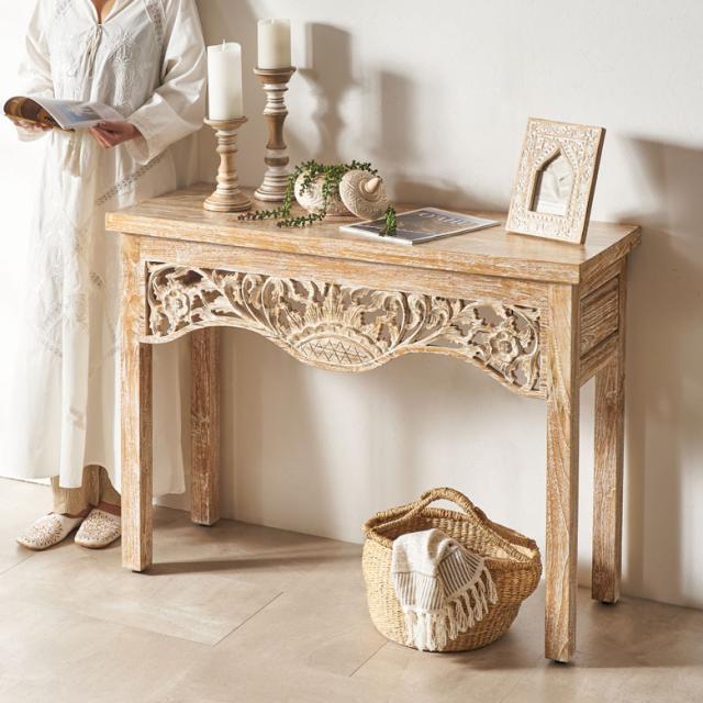 時間が経つにつれて風合いが増すチーク材を贅沢に使用しており、長く愛用できる家具としておすすめ。手彫りのカービングは、職人が数日かけて仕上げる手の込んだもの。アンティークのようなホワイトウォッシュカラーを表現する為にいくつもの工程を重ねて仕上げられています。ハンドメイドの温かみと味わいを感じさせてくれる、職人の手間と技が集結したコンソールテーブル。お家を憧れのリゾートのような空間に格上げしてくれます。