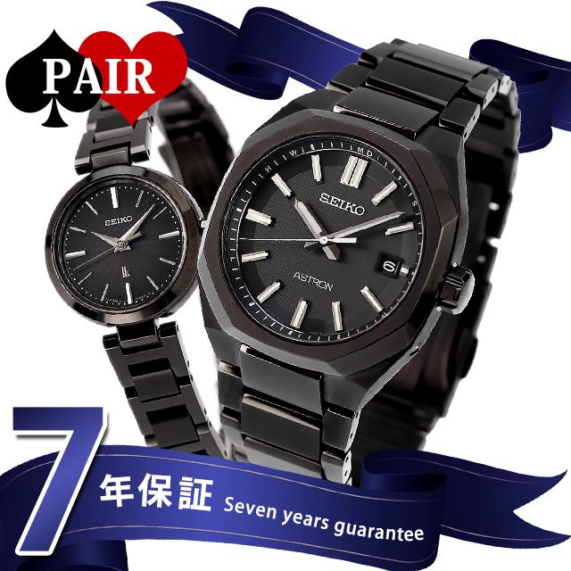 正規品 7年保証キャンペーン 送料無料 ペアウォッチ セイコー アストロン ルキア 日本製 メンズ レディース 腕時計 pair-seiko111 SEIKO ASTRON LUKIA アナログ ブラック ◆メンズモデルは、NEXTER 3rd Collection ソーラー電波の新カラー。白さを強調した質感の高いダイヤルを採用。エッジの効いたソリッドなチタンケースと力強い金属多角縁が精悍な雰囲気を演出しております。レディースモデルは、セイコールキアから、新しい小型のソーラーウオッチ。アクセサリー感覚で使える、ケース径23?の小ぶりなサイズ感と、機能を絞り込んだシンプルな姿が魅力なモデル。ケースとストラップのシャープな造形が光を反射して、小さくても存在感のある仕上がりです。ダイヤルは新開発のシアー感のある仕上げ、奥行きがあり、繊細な模様をさりげなく楽しめます。 メンズ品番:SBXY083 レディース品番:SSVR141