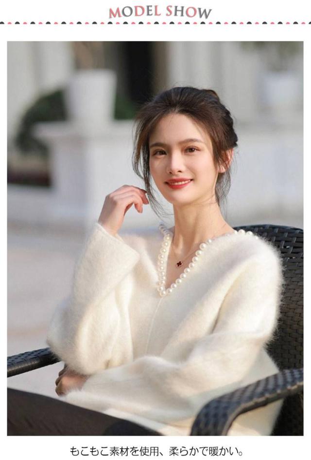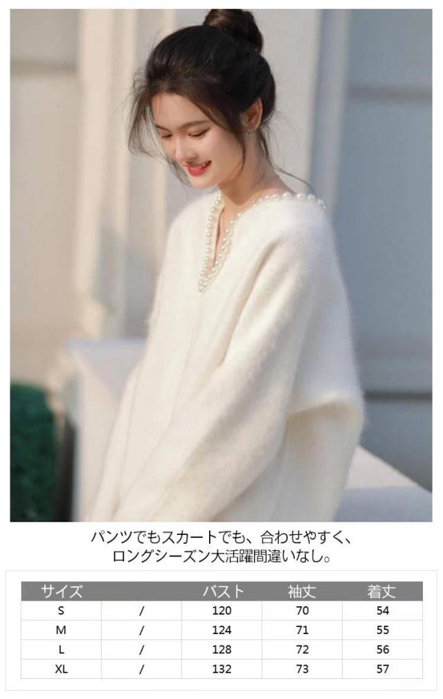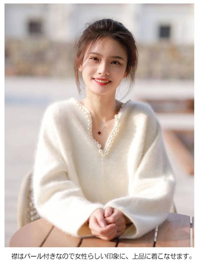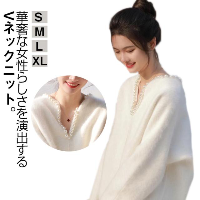 パール調 ニット セーター ニットトップス レディース 秋冬 長袖 ニットセーター プルオーバー Vネック 着痩せ 体型カバー エレガント おしゃれ フェミニン モコモコ ふんわり ビジュー 20代 30代 40代 S M L XL