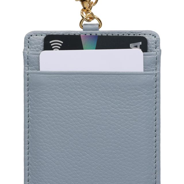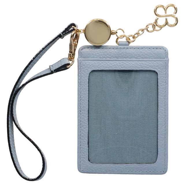 リードとストラップが付いたカードケース。リールは約40cmまで伸びるので、バッグなどにつけて使うのに便利です。柔らかく手に馴染みやすくなるように牛革を使用しています。ワンポイントとしてブランドロゴが入り、引き手には揺れるクローバーチャームが付きます。