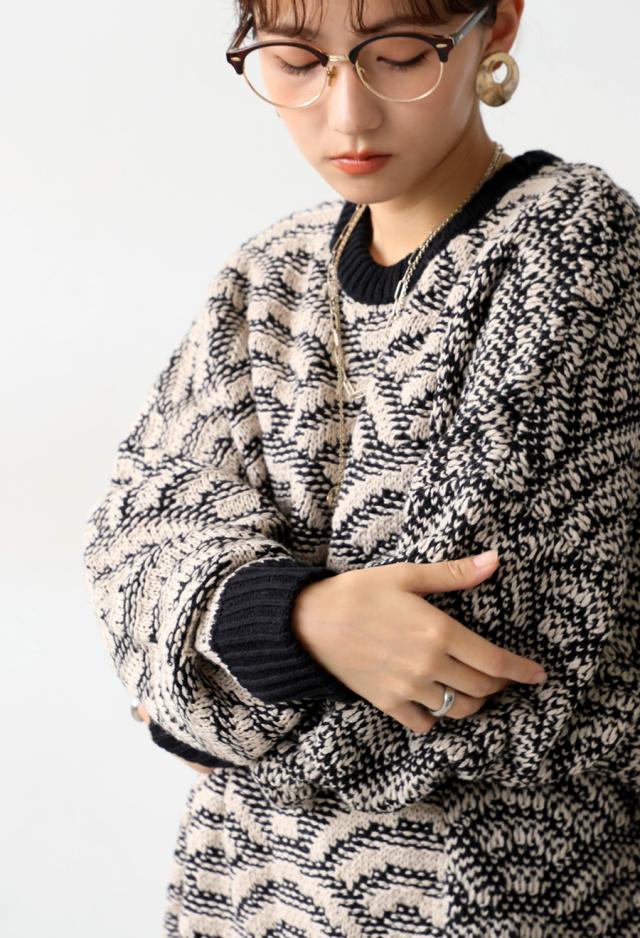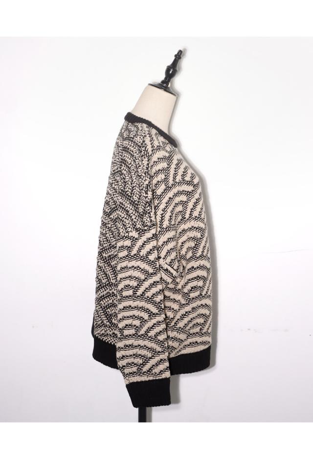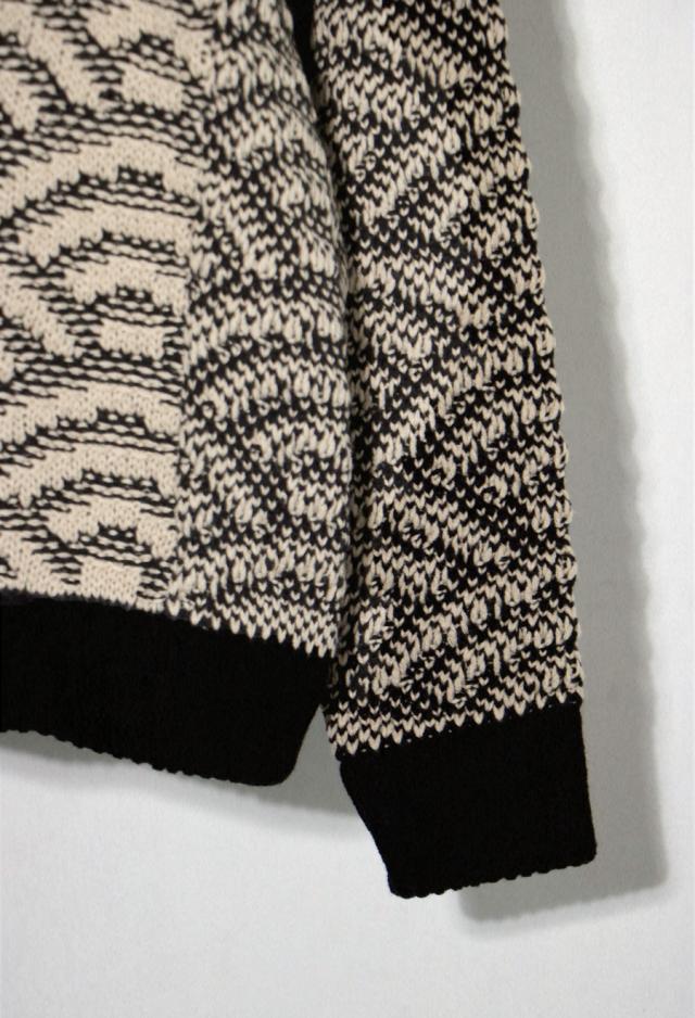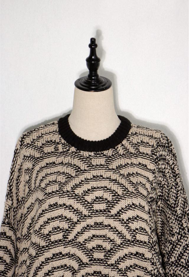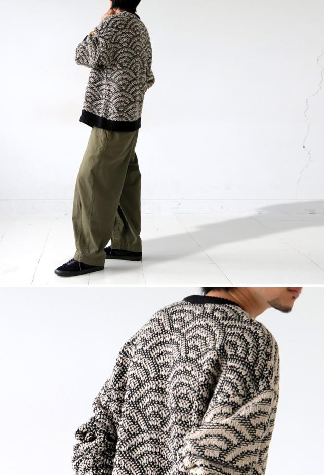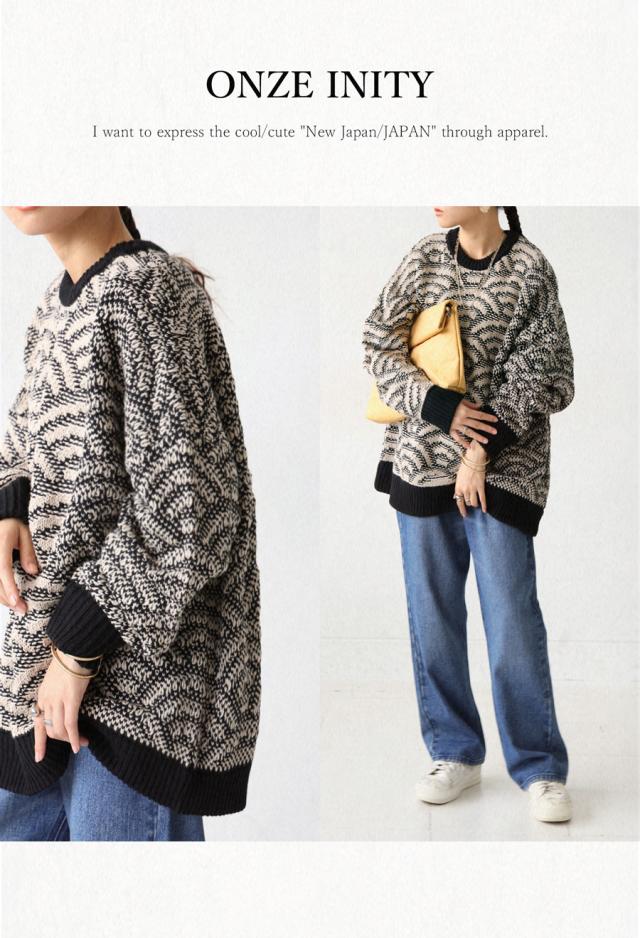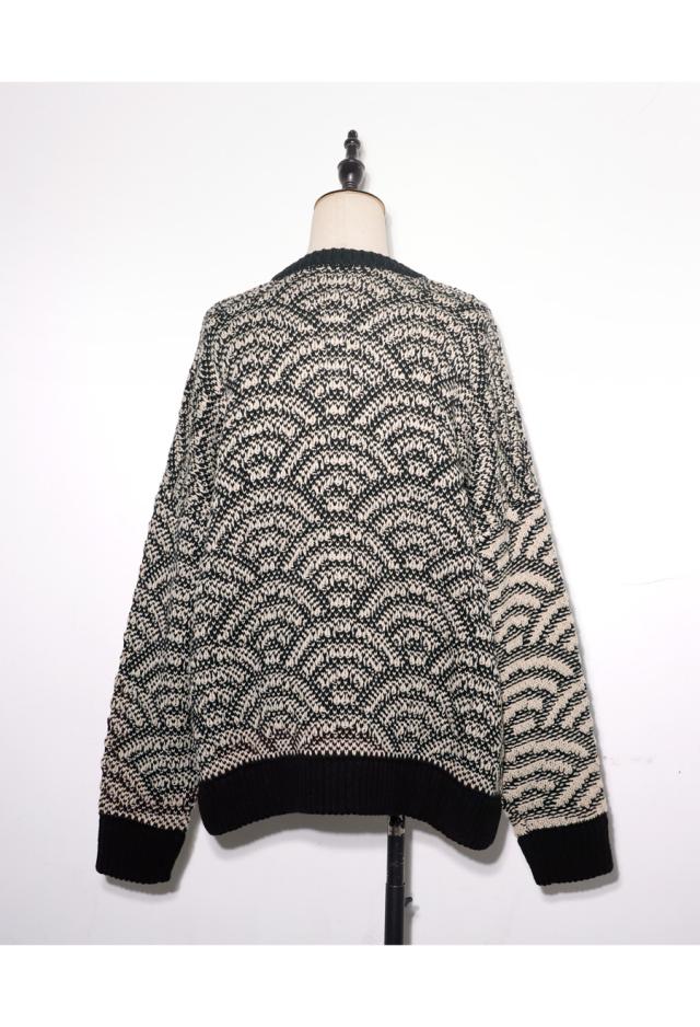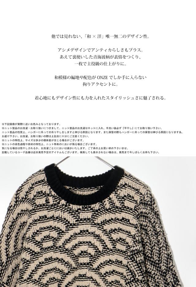 onz-0006z トップス ニット 長袖 和模様 織柄 青海波柄 柄トップス 柄切り替え 配色 アシメ 前開き 立体感 編地 ゆったり モード 体型カバー 着痩せ 大きめ セーター ユニセックス