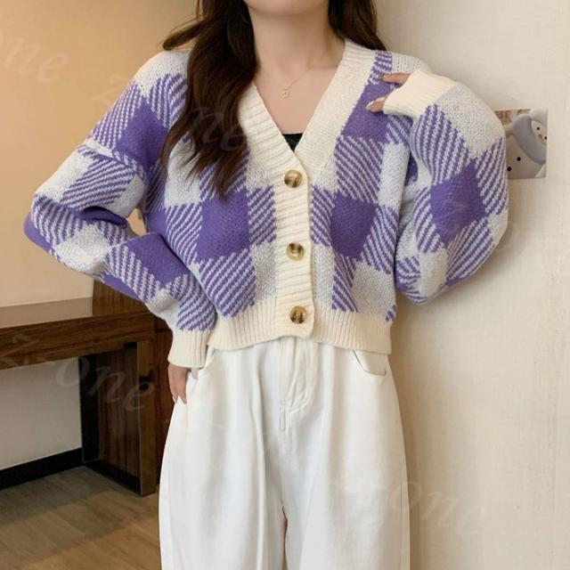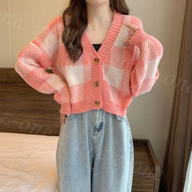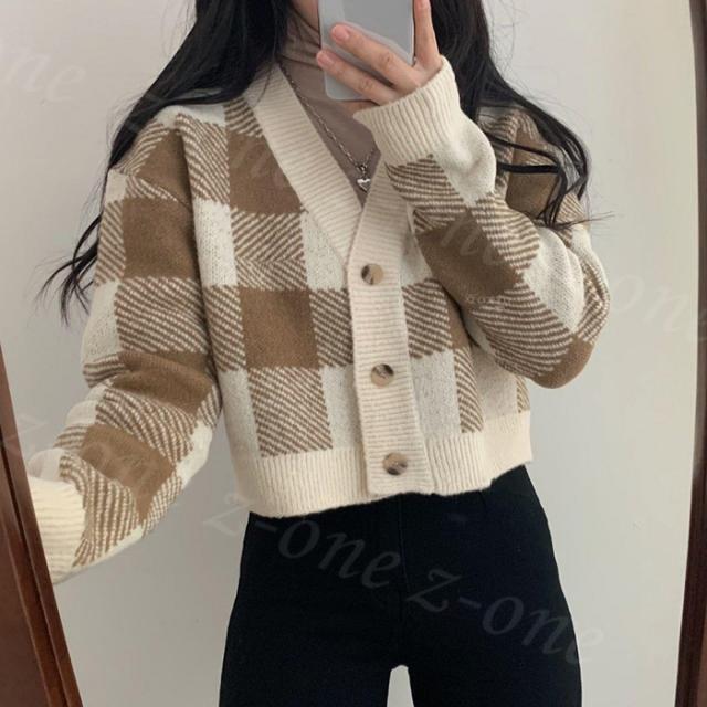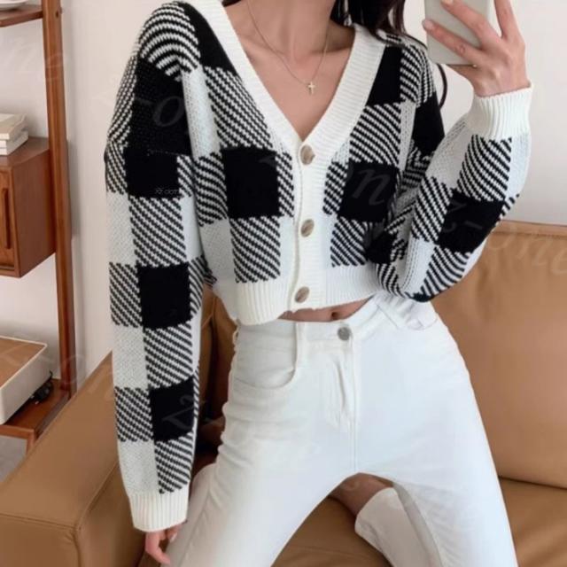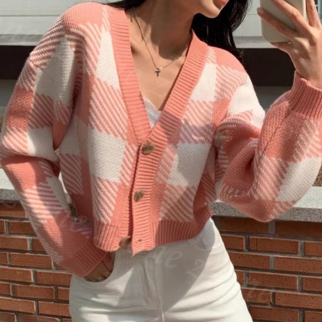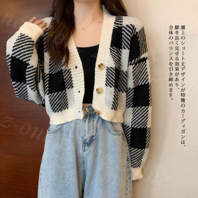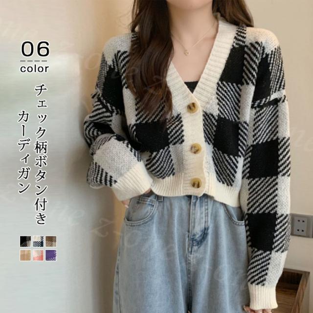 チェック柄ボタン付きカーディガン トップス ニットカーディガン レディース 秋冬 冬春新作 長袖 Vネックニット チェック柄 ボタン付き ゆったり 厚手 ショート丈 ふわふわ カジュアル 体型カバー 入学式 入園式
