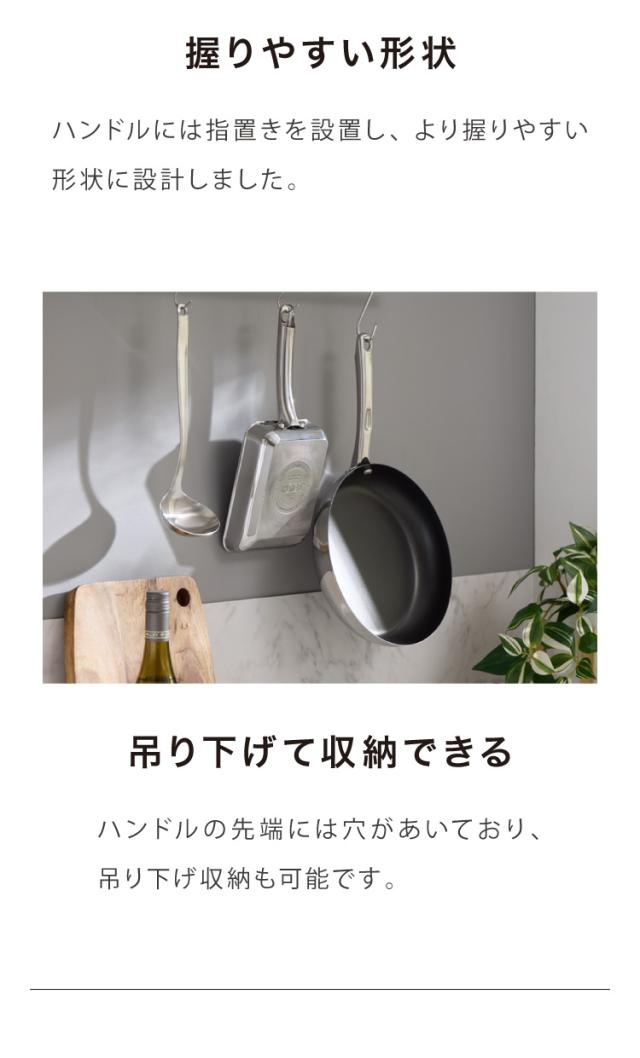 焦げ付きにくいノンステイック加工と熱くなりにくい中空ハンドル。