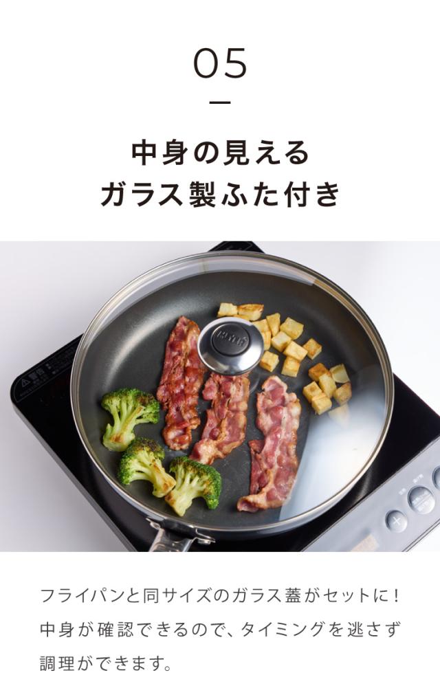 フタはガラスで中が見えるので、タイミングを逃さず調理が出来ます。持ちやすいつまみも便利です。