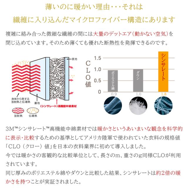 | 素材 | 側生地 ポリエステル80% 綿20% 詰め物 中綿:ポリエステル100% シート:ポリエステル55% ポリプロピレン45% (シンサレートUltra200使用) | |