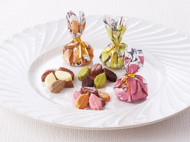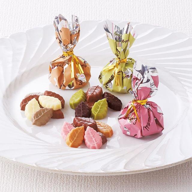 木の葉の形をした小さなチョコレート。口溶けよく、上品な甘さが広がります。3種類の包みがあり、1つの包みで3つの味が楽しめます。 モンロワールで大人気の“リーフメモリー”の、ギフトボックスです。