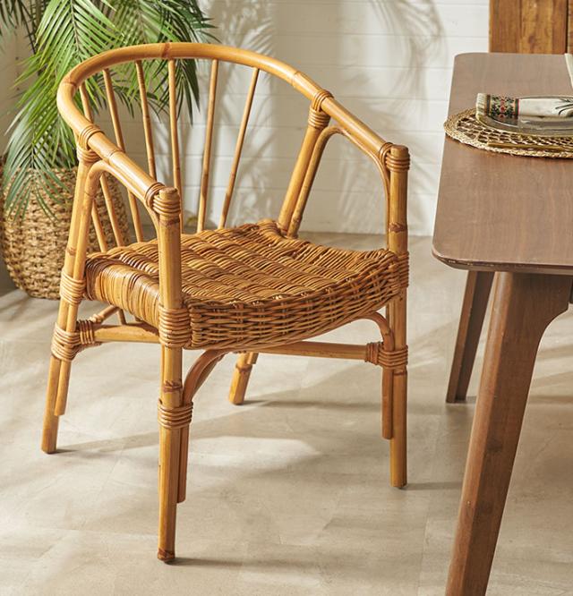 デザイン違いのラタンチェアーと組み合わせて使ってもおしゃれ。ラタンは使うほどに深みが増してくるのも魅力です。自分だけの特別なチェアーとして経年変化もたのしんで。