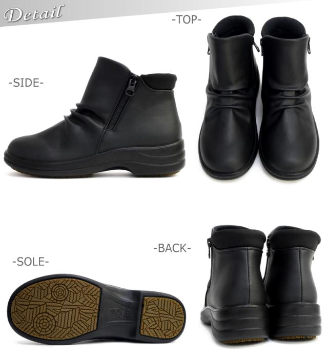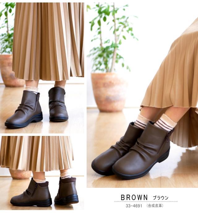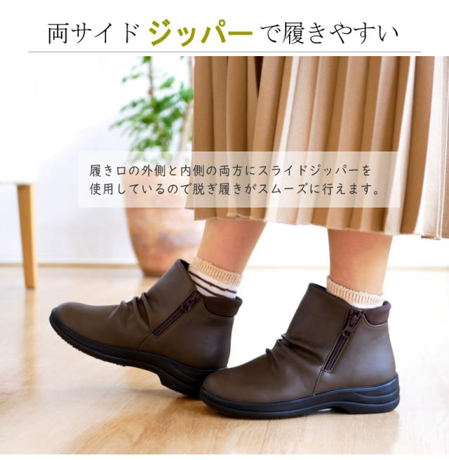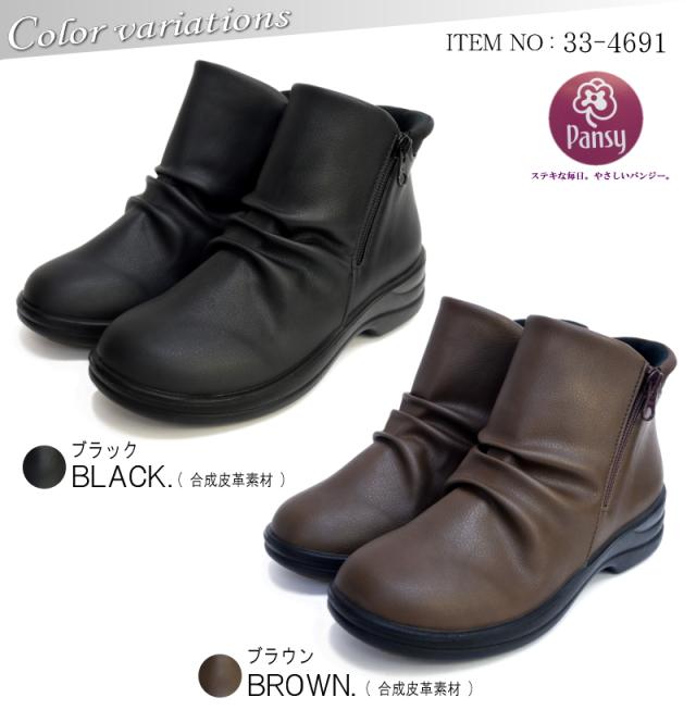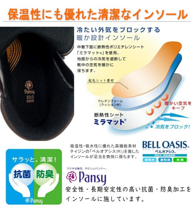 パンジー Pansy ショートブーツ レディース 4e 幅広 生活防水 抗菌防臭 防滑 保温性 断熱シート 吸水 吸湿 軽量 サイドファスナー シャーリング フラット ラウンド 黒 ブラウン 屈曲