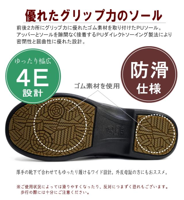 足全体をリラックスさせるゆったり4Eの幅広設計で楽々快適な履き心地です。