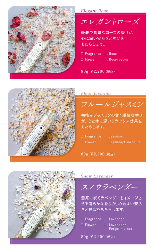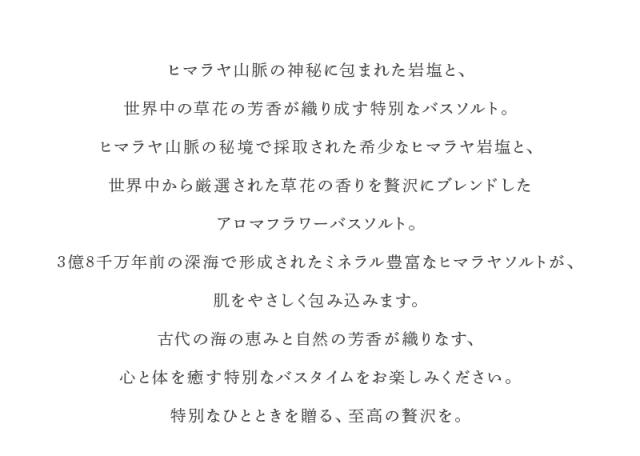 ヒマラヤ山脈の秘境で採取された希少なヒマラヤ岩塩と、世界中から厳選された草花の香りを贅沢にブレンドしたアロマフラワーバスソルト。
