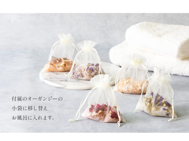 1.オーガンジーの巾着袋に1回分(手のひらに小盛り程度)を移し変えてバスタブに入れてよく溶かしてください。