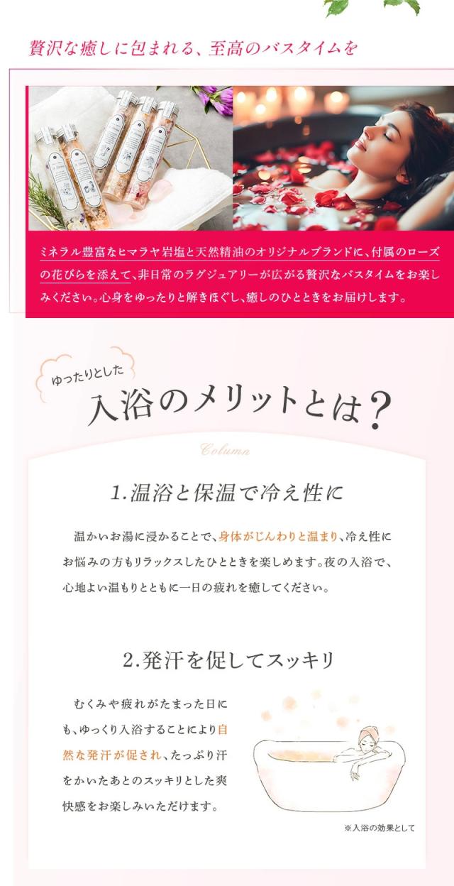 ヒマラヤ山脈の神秘に包まれた岩塩と、世界中の草花の芳香が織り成す特別なバスソルト。