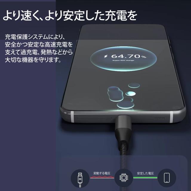 ・しなやかで高耐久・高強度のナイロンコードが外部の衝撃に耐え、内部のケーブルを断線からしっかりと守ります。