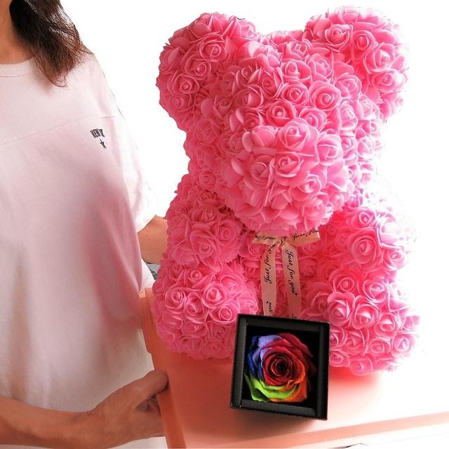 誕生日プレゼント 彼女 人気 くまちゃん ミニローズ 花束風ギフト ダイヤモンド レインボーローズ プリザーブドフラワー入りギフト ケース付き