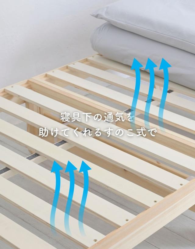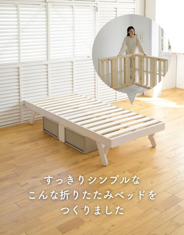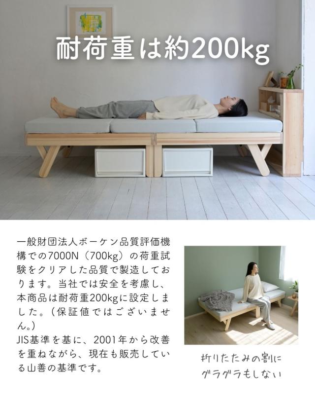 | 商品説明 | ●見た目スッキリで横に並べられる、折りたたみ式のすのこ床面のベッドフレーム ●部屋を広く使いたいにお答えするコンパクトサイズ ●工具不要、ノブを付け外しして開閉するだけのほぼ完成品 ●閉じたり広げたり、移動もしやすい折りたたみ式 ●折りたたみ時サイズ: 幅18.5 奥行90 高さ80cm ●通気性の良いすのこ仕様 ●体重をしっかり支える、厚さ1.5cmのすのこできしみを軽減 ●静止耐荷重:200kg(保証値ではございません。) ※本製品は7000N (700kg相当)の荷重試験をクリアした商品です。当社では安全を考慮し、本商品は耐荷重200Kgに設定しております。 ●四隅の角を丸く削る面取り加工 ●傷防止のフェルト付き ●連結固定用面ファスナー付き(2つ)で並べて使用可能 ●床面高: 34cm ●ベッド下内寸: 高さ25 幅57cm ※2023年12月 1日より耐荷重表記について見直しを行いました。 ●2024年10月11日より、フレーム・脚部に塗装をした「ホワイトウォッシュ」色を追加します。 |