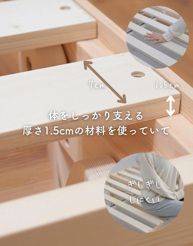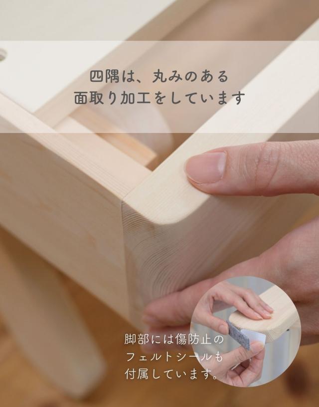 | 材質 | フレーム: 天然木(ナチュラル=無塗装、ホワイトウォッシュ=ラッカー塗装) 床面: 積層材(無塗装) |