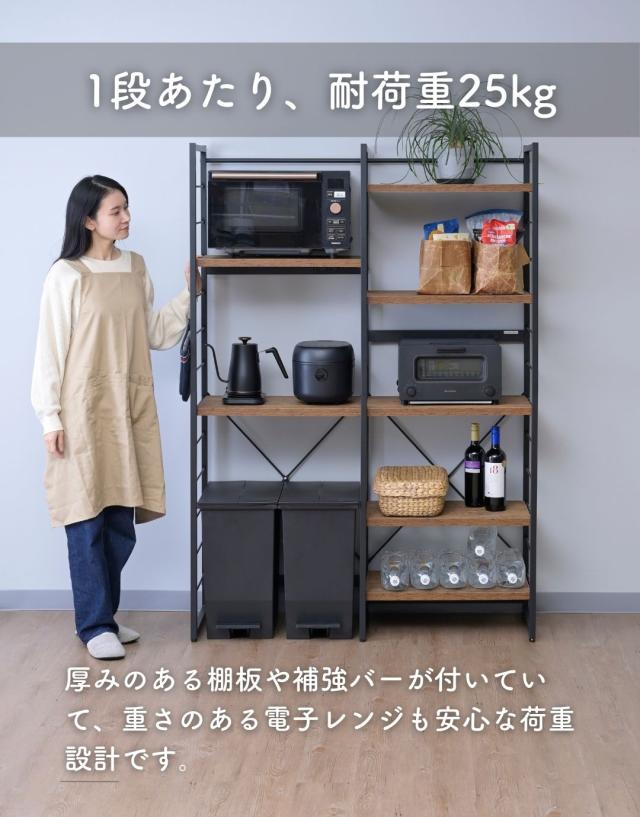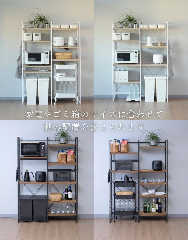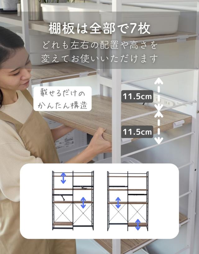 | 商品説明 | ●※2024年10月15日より、サイズ見直しをした新タイプに変更します。 ・幅105.5cm→新: 幅116cm、棚板大・小各3枚→新: 棚板大のみ7枚 ・新タイプには補強桟が増えています。 ※冷蔵庫上にも使えるオープン構造のため、設置環境によっては商品の横揺れが生じます ●冷蔵庫やゴミ箱の上を活用する収納ラック ●たっぷりの棚板で、キッチンの雑貨をすっきり収納 ●2口コンセント付き(計1500Wまで)でよく使う家電もひとまとめ ●キッチンを邪魔しないシンプルデザイン ●棚やコンセントの高さを、モノに合わせて変更可能 ●棚板を載せる、組み立て簡単構造 ●棚板は傷や汚れに強い樹脂加工仕様 ●フレームは、インテリアを邪魔しないツヤのないマット仕上げ ●可動式棚板(大)7枚、厚さ2.5cm ●棚板高さ:(最下段時)13.5cm、約11.5cm間隔・12段階調節 ●棚板サイズ:(大)幅55.5 奥行35.5cm、(小)幅44.5 奥行35.5cm ●コンセントバー位置:床から103、127、151.5cm(3段階選択可能) ●耐荷重:棚1枚あたり25、全体105kg |