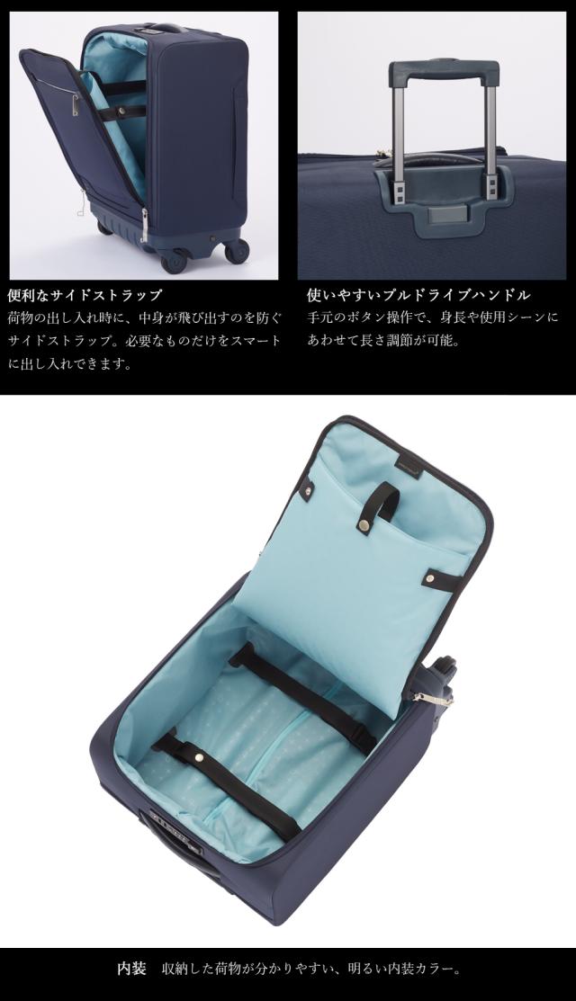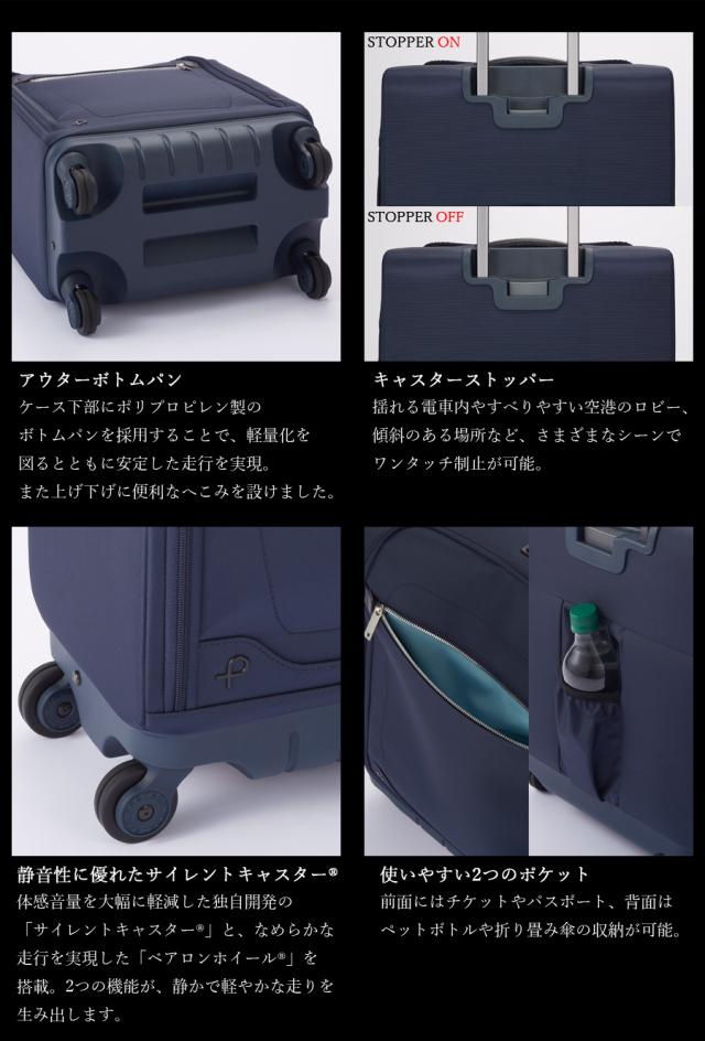 機能一覧:4輪/PC収納/ボトルホルダー/TSダイヤルロック/ベアロンホイール/国内線100席未満機内持込み