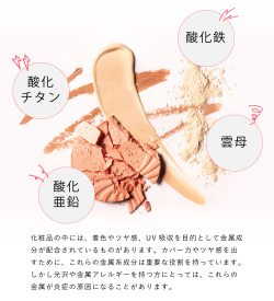 酸化亜鉛、シリカ、マイカ、ジメチコン、水酸化Al、ステアリン酸、ヒドロキシアパタイト、メチルパラベン、グリチルリチン酸2K、BG、水、ヒメフウロエキス、ヨモギ葉エキス、酸化鉄、タルク、酸化チタン、ホウケイ酸(Ca/AI)、酸化スズ MADE IN JAPAN
