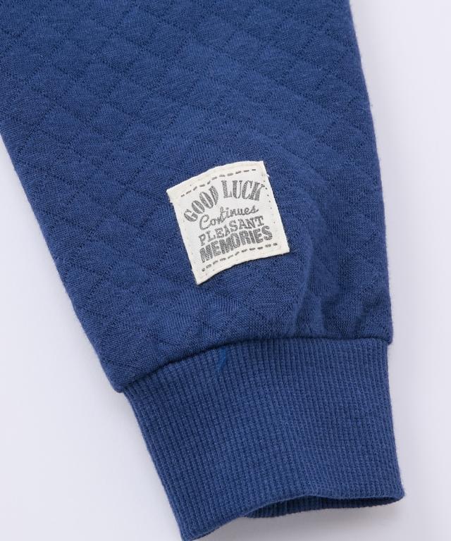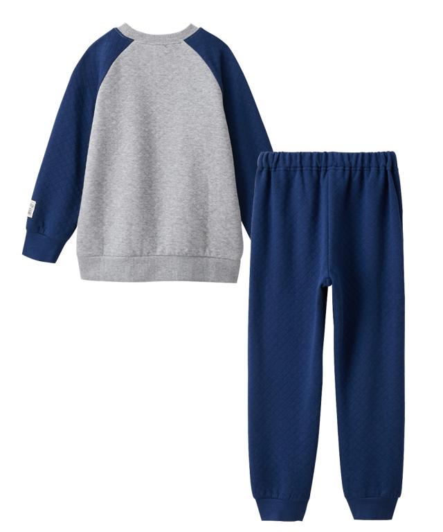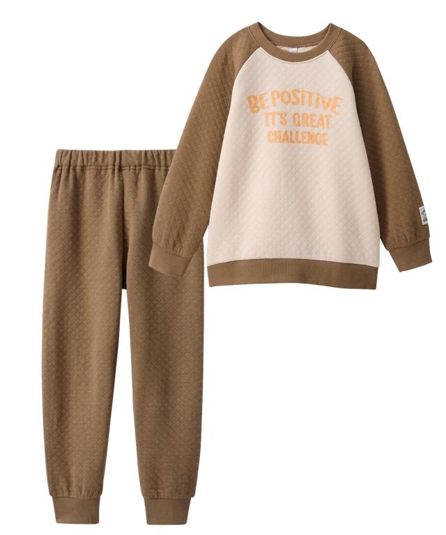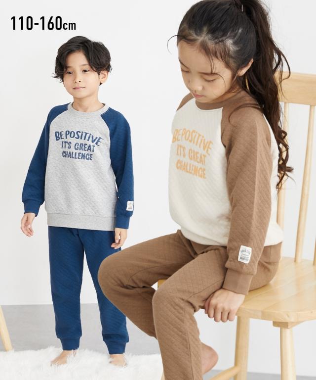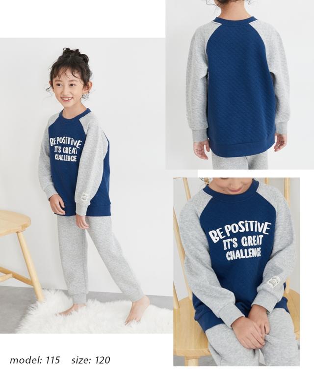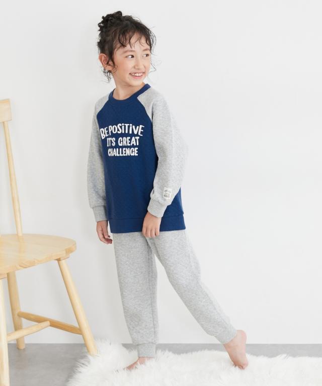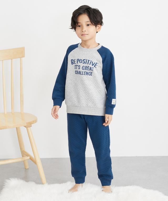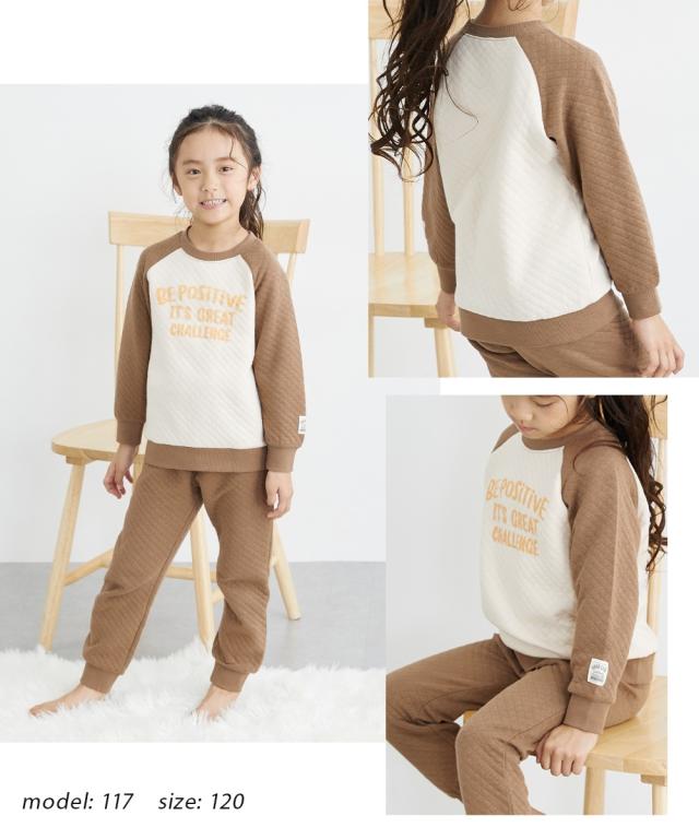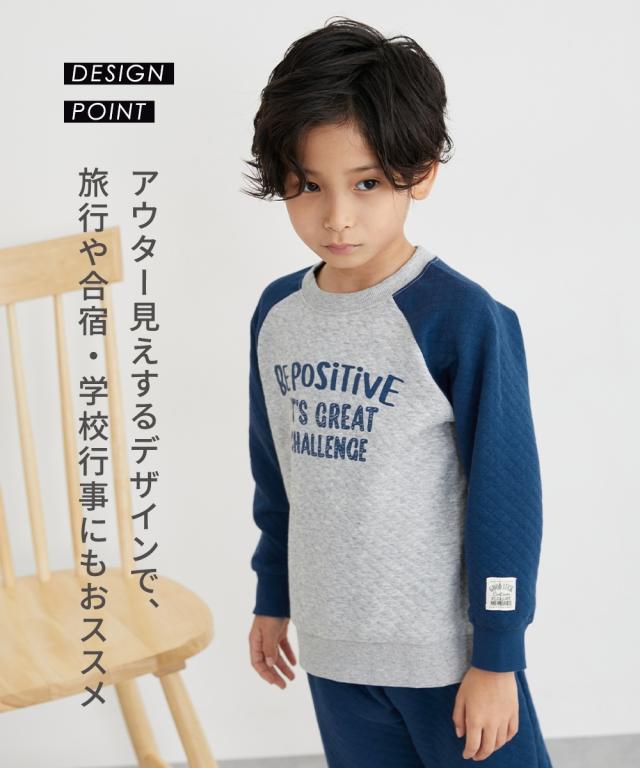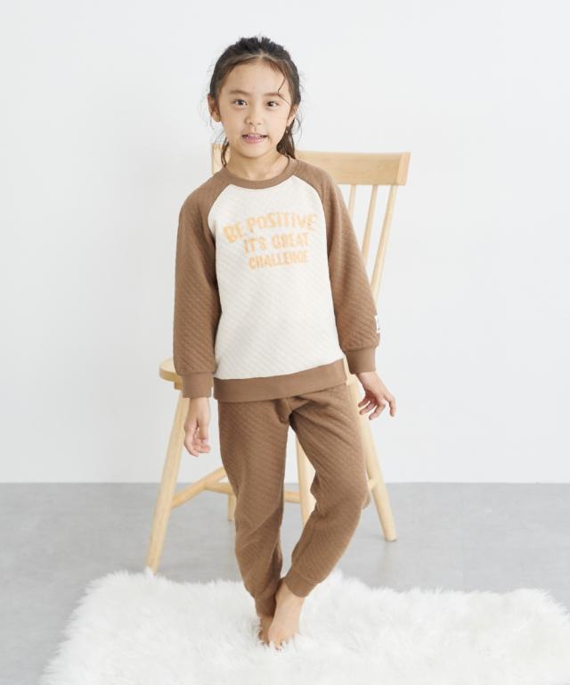 ふんわりやわらかなニットキルトで着心地快適 ラグラン袖の配色がおしゃれなルームウェアです。 ■デザイン ・落ち着いた色合いの3色展開 ・大きめのロゴプリントや袖口のワッペンがアクセント ■ポイント ・袖口と裾はリブ仕様で動きやすく、冷たい空気も入りにくい ・ウエスト内側にネームタグ付きでお泊りにも便利&前後がわかりやすくお着替えしやすい。 ・ウエスト総ゴム仕様で着脱しやすい ■素材 ・生地の両面は綿100%のキルト素材でやわらかく、肌ざわり