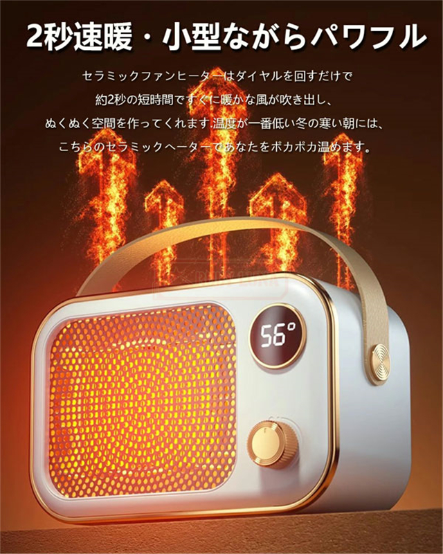 | 【軽量・超コンパクト・持ち運び楽々】 | ◆約0.83kgの超軽量・ハンドルが付いているから、コンパクト設計、手の力が弱い方が運んでもラクラクで、使う場所を変えたい時や、お掃除の際も簡単に移動できます。見た目がスタイリッシュで部屋にピッタリ調和し、暖房と装飾の両方に使用できます。インテリアに馴染みやすく、卓上や足元にもスッキリ置けるミニセラミックファンヒーター。空気を汚さず、素早く暖を取れる電気式なので、特に、寒い冬に、勉強の時とか料理を作る時とか仕事する時とか、足元に置くのは一番適用です。小さなお子様からお年寄りまで、??で使えます。冬以外の季節に使用しない場合、コンパクトサイズで片隅に置けば邪魔になりません。20.7×13.3×11cmとミニサイズ! |