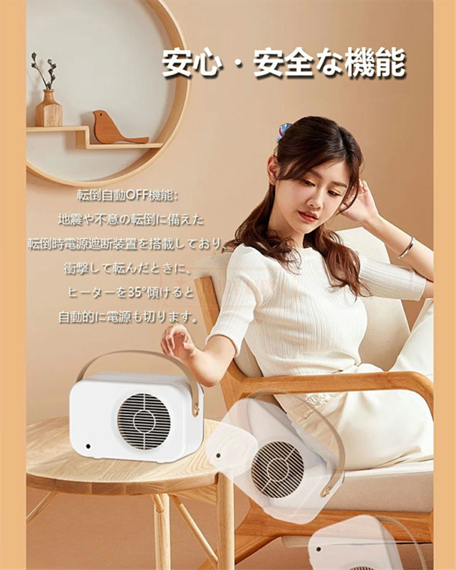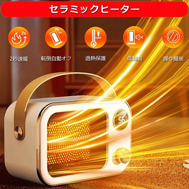 | 【安全・安心なセラミックヒーター】 | ◆本電気ヒーターは多方面まで安全保護を備えています。a、過熱保護:温度の過剰上昇を感知したら自動的に電源が切れ、高齢世帯にも安心してお使いいただけます。b、転倒保護:稼働中に倒したりすると、自動的に電源が切れ、火傷や火事になる心配もなくなります。c、明火無しで電気加熱:燃料補給が不要で明火無し、お部屋の空気も汚れなくなります。d、難燃性防火材の使用:ABS防火材が採用され、ペットや子供のいる家庭にも適用されます。マイナスイオン発生器が内蔵され、空気を清浄に保ちつつ有害な細菌や物質を減少させます。LEDディスプレイは情報を鮮明に表示し、動作状態や時間調整を一目で確認できます。 |