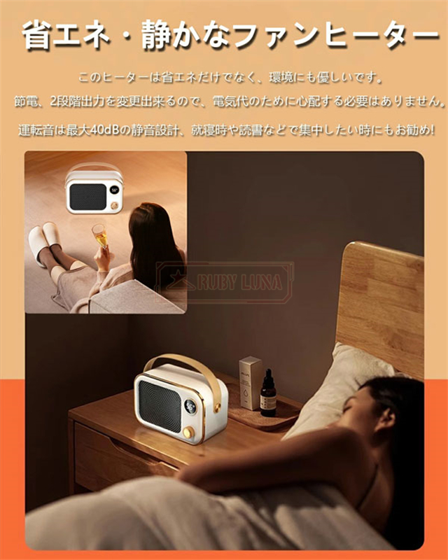 | 【省エネ・無臭・静かなファンヒーター】 | ◆このヒーターは省エネだけでなく、環境にも優しいです。節電、2段階出力を変更出来るので、電気代のために心配する必要はありません。無臭、灯油やガスなどの燃料を燃やさないから、嫌な臭いがしない。内部の加熱部分には保護コーティングがあり、加熱したら揮発しますので最初の数回使用は少しニオイがありますが本製品は環境に優しい材料を採用しております。静かな図書館並みの37デシベル。運転音は最大でも36dBととても静か。寒い冬の間も落ち着いて眠れますし、仕事の妨げにもなりません。読書等で集中したい時にもおススメです。1.3mの電源コード付き、ニーズにお応えする場所を気軽に選び、気兼ねなくヒーターを置けます! |