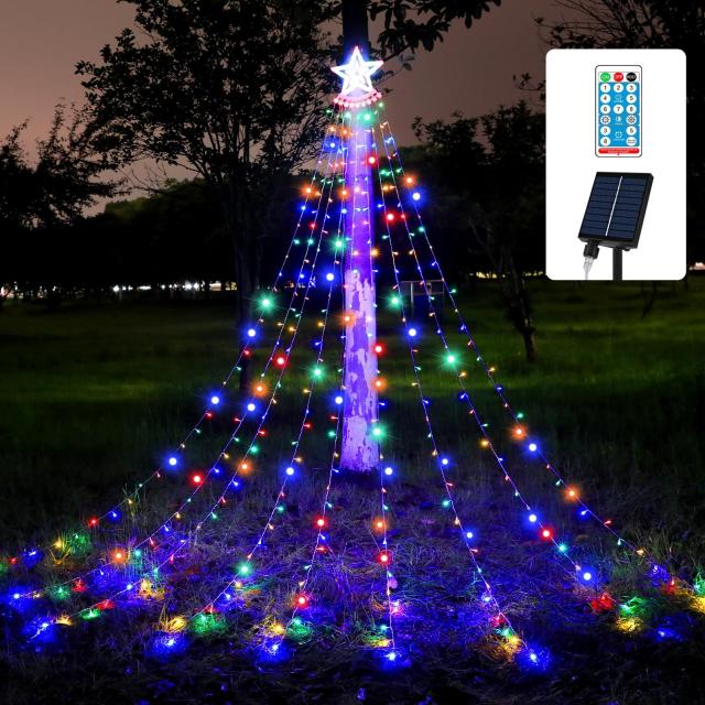 ・星型モチーフ長さ:9本*3.5m、電源コードの長さ約5m、重さ:約0.8kg。防水:IP65。高輝度350LED電球を採用されて、想像以上の明るさが見えて省エネできます。全8種点灯モードが付きます。リモコンから点灯モード/点灯輝度、タイマー等機能を設定できます。連続変更、波状変更、点滅変更、ちらつき変更、急速変更、低速変更、ドリーム変更、固定点灯という8種の光るパターンがあるイルミネーションライトです。?マルチカラー:赤、青、緑、黄4色ミックス。ひとつひとつのLEDがカラフルに優しく光り輝いて幻想的でロマンチックな空間を演出します。クリスマスやパーテイーの飾り付けに、お部屋や窓辺の間接照明・インテリアとして、テラスやお庭のアクセントやライトアップにぜひバレンタインデーやクリスマス、新年、誕生日、家族パーティー、ツリー 飾り付け 庭 ガーデン 芝生 植え込みに飾りつけのイメージに合わせ不雰囲気が作ります。