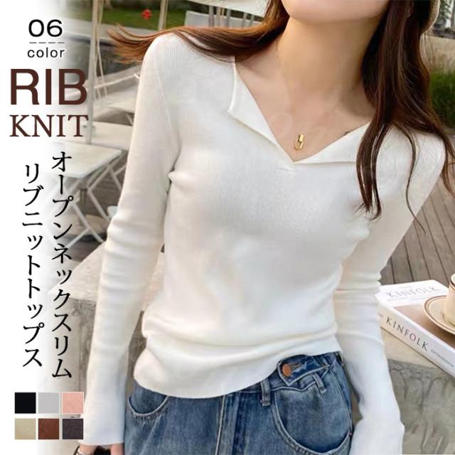【 オープンネックスリムリブニットトップス 】