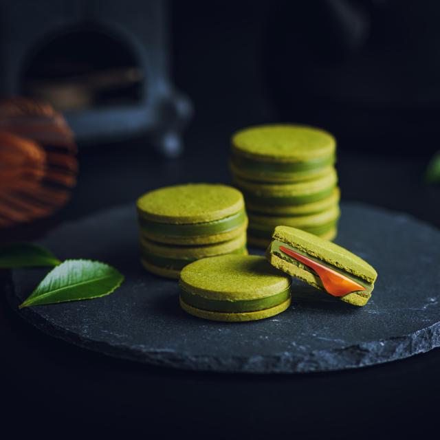 贅沢な厚みをもたせた抹茶チョコレートの中に、とろける生キャラメルを閉じ込め、さっくり食感の抹茶クッキーでサンド。この3つが重なり合った時全く新しい華麗なる調和を作り出します。