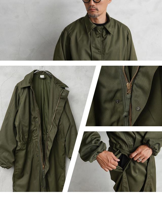 | 商品説明 | リジェクト 訳あり品 実物 新品 デッドストック 米軍 ヘリクルー メカニック カバーオール ブラスジップのご紹介です。 制式名称:COVERALLS,COLD WEATHER,MECHANICS 希少な未使用デッドストックで入荷した米軍放出アイテムのメカニック用カバーオール(つなぎ)です。ラベルに「COLD WEATHER」と記載のある通り、オーバーパンツのように衣類の上から着用できるようにゆったりしたサイズ感で作られていて、メカニックが寒冷地での作業や防寒用として使用されていました。素材自体は分厚いわけではありませんので様々な季節で使えるカバーオールです。 前開きジッパーにカバー付きで左太ももまでジッパーが続いているデザインが特徴です。1973年以降に製造されたブラスジップバージョンです。 上半身内側と袖裏には滑りの良いライニング付きで、背面両サイドにはアクションプリーツがあり機動性も確保しています。ウエストはゴムで適度にフィット、下半身のフロント側は2枚仕立てで贅沢な作りになっています。ウエスト部分のサイドポケットは内側アクセス用の貫通ポケットです。内側に履いたパンツのポケットから物を取り出すためのオーバーパンツならではのディテール。バックポケットは右側に1箇所備わっています。 変則的な袖の作りなどもゆとりを出すために計算されたディテールです。また袖先と裾部分にはゴムシャーリングで風の侵入をシャットアウトします。ややゆったりした作りで動きやすく、ワークウェアにはもちろん、タウンユースに着ても非常にかっこいいです。 こちらはボタン等パーツの破損・欠損など全体的に不具合のある商品を選別しております。多少のリペアを施していただいてからの着用、もしくはリメイク資材としてもおすすめです。ファーストクオリティの品質を強くお求めの方は念の為ご購入をお控えくださいますようお願い致します。 | ||||||||||||||||||||||||||||||||||||
