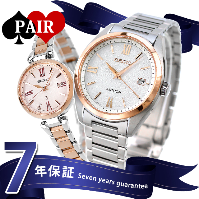 正規品 7年保証キャンペーン 送料無料 ペアウォッチ セイコー アストロン ルキア 日本製 メンズ レディース 腕時計 pair-seiko115 SEIKO ASTRON LUKIA アナログ ホワイト ピオニーピンク ピンクグラデーション シルバー ピンクゴールド ◆メンズモデルは、初代クオーツアストロンのケース意匠を踏襲しつつ、ドレスウオッチらしい薄型フォルムへとアップデートし、カーブサファイアガラスが高級感を演出。4時位置のボタンは沈頭仕様にすることで、チタンケースの流れるような造形を際立たせ、すっきりと洗練された印象に。レディースモデルは、セイコールキアの「LUKIA Grow」から、みずみずしく咲く芍薬(ピオニー)をデザインモチーフにしたソーラー電波の新デザイン。カーブガラスを含めた丸みのあるケースフォルムは、芍薬の柔らかい世界観をイメージしました。中心に向かってほんのりと膨らむ球面形状が特徴です。 メンズ品番:SBXY034 レディース品番:SSQW082