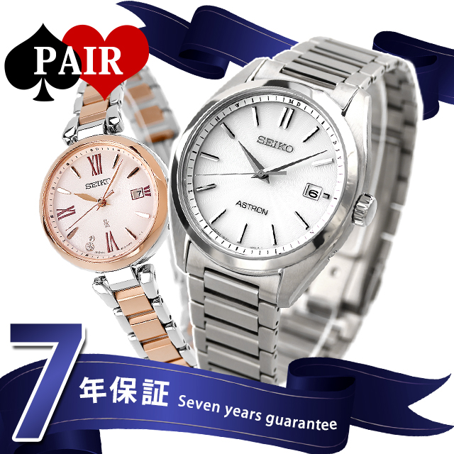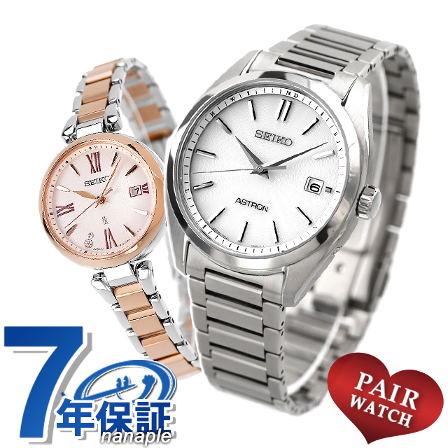 正規品 7年保証キャンペーン 送料無料 ペアウォッチ セイコー アストロン ルキア 日本製 メンズ レディース 腕時計 pair-seiko119 SEIKO ASTRON LUKIA アナログ シルバー ピオニーピンク ピンクグラデーション ピンクゴールド ◆メンズモデルは、初代クオーツアストロンのケース意匠を踏襲しつつ、ドレスウオッチらしい薄型フォルムへとアップデート。広見切り、細縁の王道ダイヤルレイアウトは、文字情報を極力排し、仕上げ分けされた時分針によって高い判読性・視認性を誇る実用性の高いモデルです。レディースモデルは、セイコールキアの「LUKIA Grow」から、みずみずしく咲く芍薬(ピオニー)をデザインモチーフにしたソーラー電波の新デザイン。カーブガラスを含めた丸みのあるケースフォルムは、芍薬の柔らかい世界観をイメージしました。一番のデザインポイントは、”Drop Dial(ドロップダイヤル)。中心に向かってほんのりと膨らむ球面形状が特徴です。 メンズ品番:SBXY029 レディース品番:SSQW082