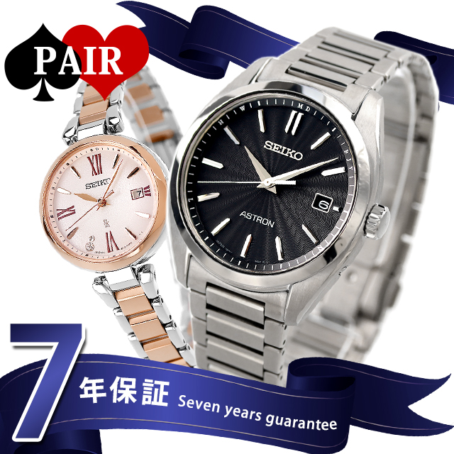 正規品 7年保証キャンペーン 送料無料 ペアウォッチ セイコー アストロン ルキア 日本製 メンズ レディース 腕時計 pair-seiko120 SEIKO ASTRON LUKIA アナログ ブラック ピオニーピンク ピンクグラデーション シルバー ピンクゴールド ◆メンズモデルは、初代クオーツアストロンのケース意匠を踏襲しつつ、ドレスウオッチらしい薄型フォルムへとアップデート。広見切り、細縁の王道ダイヤルレイアウトは、文字情報を極力排し、仕上げ分けされた時分針によって高い判読性・視認性を誇る実用性の高いモデルです。レディースモデルは、セイコールキアの「LUKIA Grow」から、みずみずしく咲く芍薬(ピオニー)をデザインモチーフにしたソーラー電波の新デザイン。カーブガラスを含めた丸みのあるケースフォルムは、芍薬の柔らかい世界観をイメージしました。一番のデザインポイントは、”Drop Dial(ドロップダイヤル)。中心に向かってほんのりと膨らむ球面形状が特徴です。 メンズ品番:SBXY033 レディース品番:SSQW082