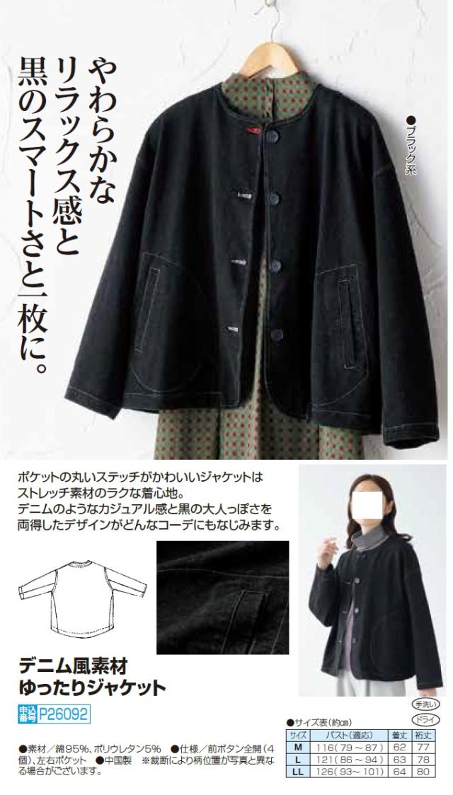 デニム風素材 ゆったりジャケット ブラック ノーカラージャケット アウター 黒 ステッチ レディース 婦人服 ミセス シニア 女性 ストレッチ クルーネック カジュアル シンプル 大人かわいい 体型カバー ファッション 50代 60代 70代 80代 母の日 お母さん 秋冬 nss p26092