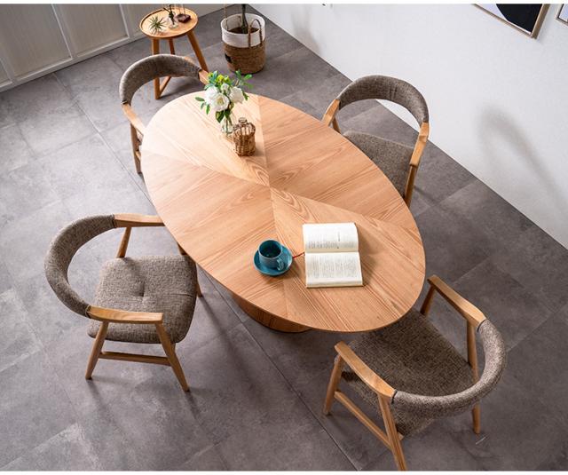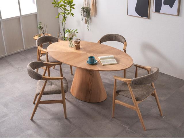 突板素材で木本来の温かみのある風合いを感じるスタイリッシュな楕円形の天板。