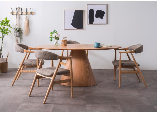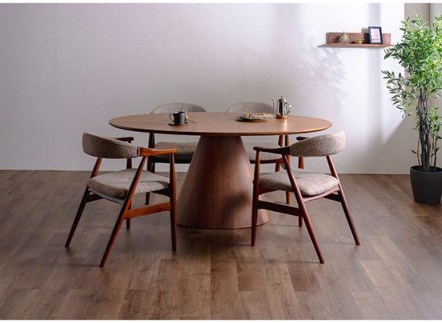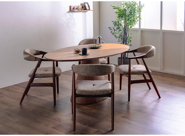 美しい木目と丸みのあるデザインが魅力的なダイニングテーブル。