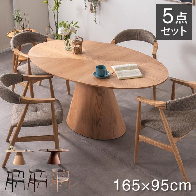 ダイニングセット チェア4脚 ナチュラルテイスト 5点セット 楕円テーブル 幅165cm リビングテーブル 円柱脚 アームチェア ラウンド 木目 天然木 おしゃれ リビング ダイニング 食卓 椅子(代引
