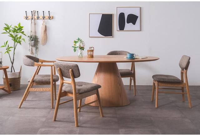 美しい木目と丸みのあるデザインが魅力的なダイニングテーブル。